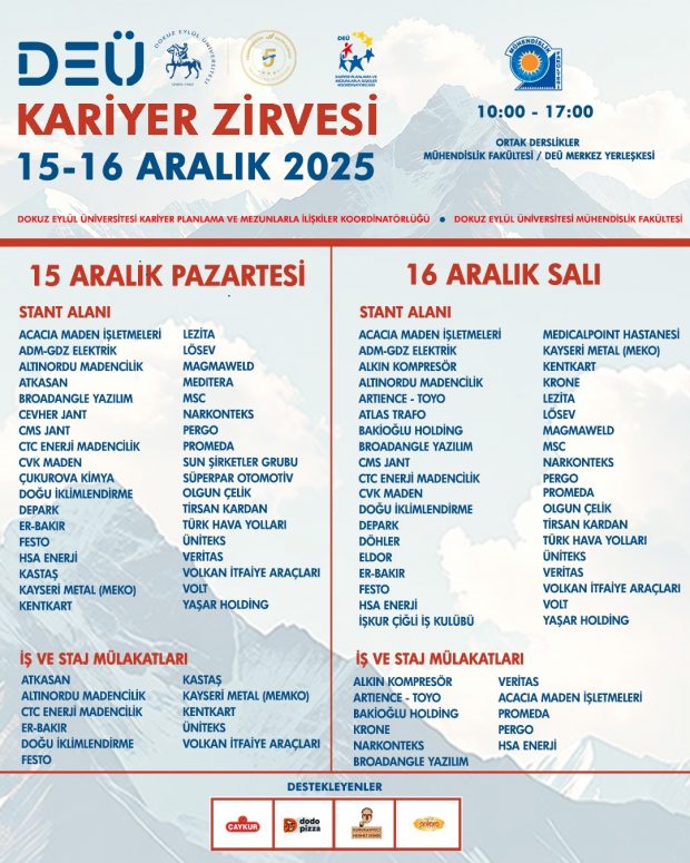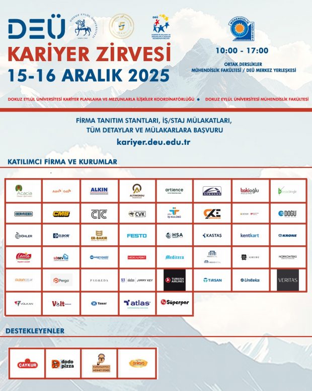 Üniversitemiz Kariyer Planlama Koordinatörlüğü ve Mühendislik Fakültesi işbirliğiyle gerçekleştirilecek olan ” DEÜ Kariyer Zirvesi 2025″ 15-16 Aralık 2025 (Pazartesi-Salı) tarihlerinde DEÜ Merkez Yerleşkemiz Mühendislik Fakültesi Ortak Derslikler Binası‘nda gerçekleştirilecektir.