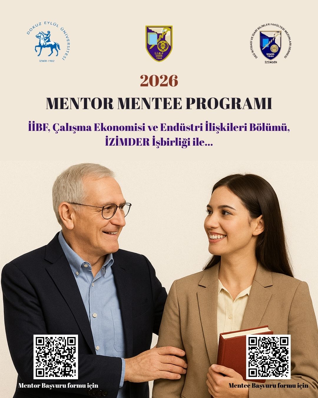MENTOR & MENTEE 2026 Programı Başlıyor! Kariyerine yön vermeye, iş dünyasının dinamiklerini mezunlarımızın rehberliğinde öğrenmeye hazır mısın? DEÜ İİBF Mezunlar Derneği (İZİMDER), 50 yıllık birikimiyle DEÜ İİBF ve Çalışma Ekonomisi ve Endüstri İlişkileri Bölümü işbirliğinde Mentor & Mentee Programını başlatıyor! Bu program sayesinde, aynı sıralardan geçmiş, alanında deneyim sahibi mentorlarla birebir çalışarak akademik bilginin üzerine profesyonel beceriler ekleme fırsatı yakalayabilirsin.